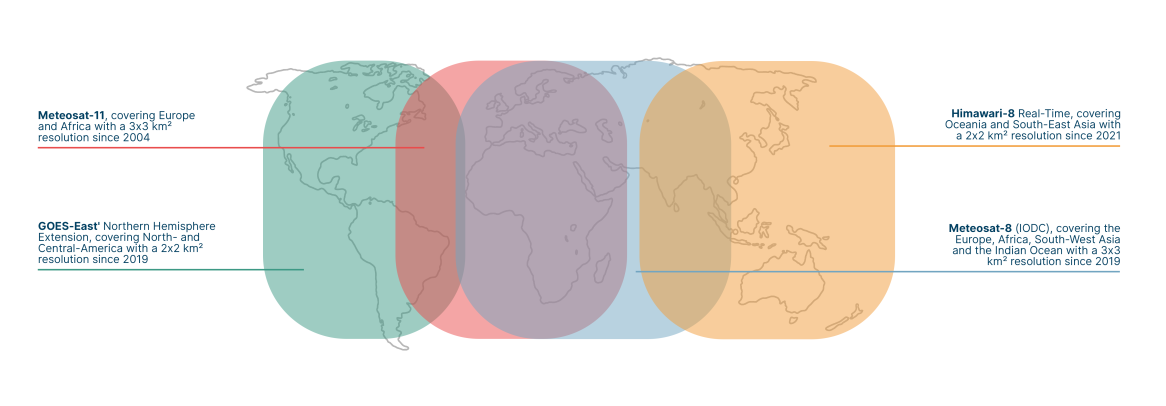 - Meteosat-8 (IODC), covering the Europe, Africa, South-West Asia and the Indian Ocean with a 3x3 km² resolution. Data is available as from 2019.