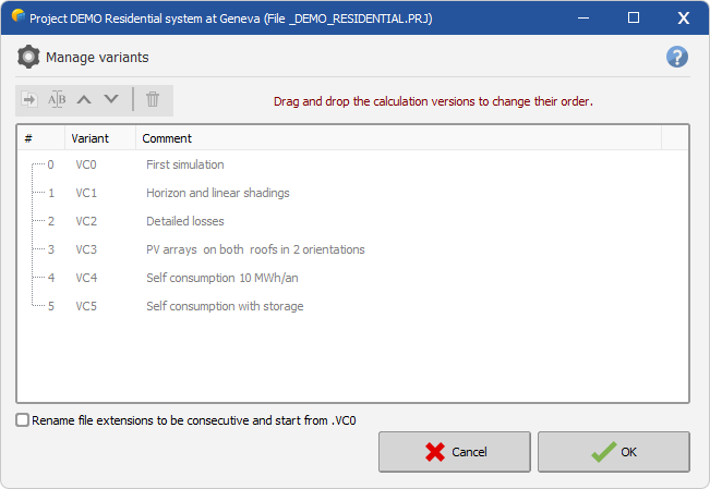 In the variants management dialog, it is possible to copy, edit, reorder and remove variants of the project: