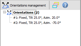 In the shading scene, you can quickly visualise the list of orientations defined in your variant and used in the 3D scene. Read Orientations in PVsyst 8 for more details about the orientation management in PVsyst 8.